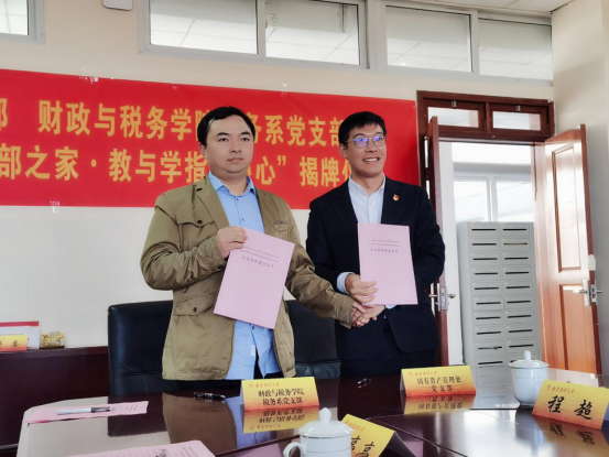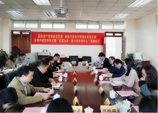 税务系党支部在德经楼408会议室举办支部共建签约仪式暨“支部之家·教与学指导中心”揭牌仪式。校党委常委、总会计师黄建元、校机关党委书记郝园园出席仪式,国有资产管理处处长丁书俊、副处长庄素娟、处长助理王建立,toptoon