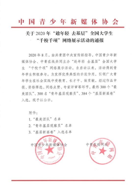据悉,“趁年轻 去基层”2020全国大学生“千校千项”活动自启动以来得到全国各高校青年学生的积极参与,共遴选出300个“最美团队”、300名“青年基层观察员”、384个“基层新画卷”。
