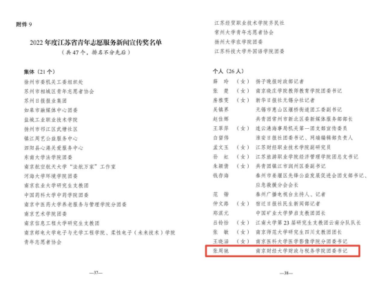 张周驰老师获“2022年度江苏省青年志愿服务新闻宣传奖”,税收2002班张颖获“2022年度江苏省优秀青年志愿者”称号。这也是toptoon