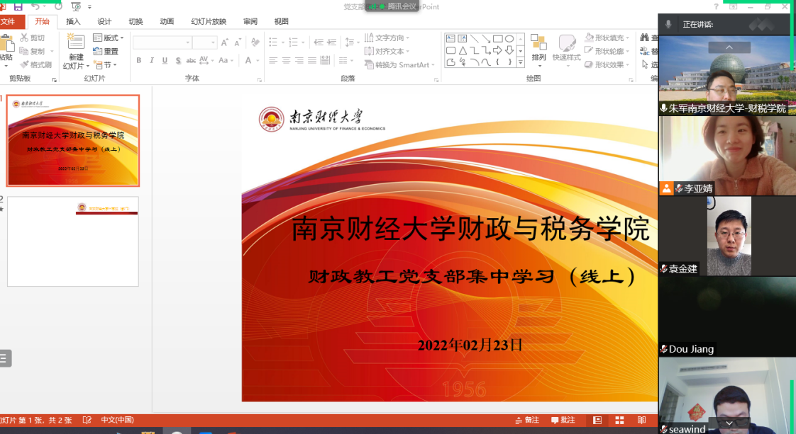 2月23日起,学院各党支部按照要求开展2月份党员学习日。行政党支部由支部书记贾晓燕传达了会议精神,支部成员在学习结束后就意识形态工作、学院未来发展前景、学校“十四五”规划发展等方面发表个人学习感悟。本科生第一支部开展线上会议,支部书记朱思颖带领同学们学习研讨,邵淑玲同学认为,作为青年党员,在为理想全力以赴的同时,也应该在思想上与党中央保持高度一致,尽可能地帮助他人,融入集体,为集体做出贡献。研究生党支部的学生党员,在支部书记周立新带领下进行了集体学习,并积极参与交流,表达自己对会议精神的感受。财政系党支部召开线上集中学习,党支部书记朱军同志主持,青年教师张海峰、耿峰分别领学了相关文件。集中学习中,与会党员教师结合工作实际,畅谈心得体会。大家一致表示,要按照上述文件精神以及葛道凯厅长、张利民书记和程永波校长的讲话指导工作实践,提升思想境界,改进工作作风,增强服务效能,筑牢师德师风底线,切实发挥好党员先锋带头作用。