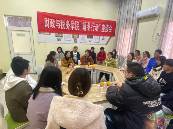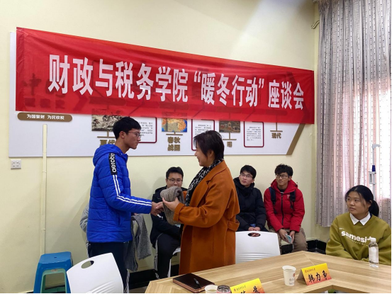 座谈会上,韩力争部长为同学们发放了学院精心准备的“暖冬”大礼包,内含围巾、手套等御寒物资并亲手为同学们围上围巾,提醒同学们天气转凉,注意保暖。韩力争部长对同学们表示慰问,并向同学们介绍了国家助学政策,希望同学们能把在南财这个大家庭所得到的力量和暖意传递给社会,为社会做贡献。她表示学生资助工作是一项长期工作,学校和学院会长久坚持,继续努力落实到每一位需要帮助的同学更好地完成学业,同时希望受助学生志存高远,不忘初心,努力学习实现自身理想。