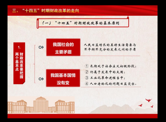 报告中,马海涛教授回顾了“十三五”时期及以前年度的财政改革,着重分析了改革内容和改革亮点,并结合自身经历,教导同学们学习财政要有历史观;其次,他科学地分析了目前——“十四五”开局之年的国内外形势,认为:国内经济形势稳中向好趋势不变,而外部不确定性加大,当前时代是机遇与挑战并存的;然后,马海涛教授从财政体制改革、预算制度与财政支出结构改革、税制与政府收入体系改革和财政政策改革等方面详细讲述了“十四五”时期财政改革的走向。最后,朱军教授结合论文写作、教学研究等方面对本次讲座进行了总结。
