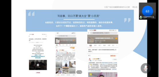 8月2日晚,江苏广电总局融媒体toptoon记者明玉花老师为同学们进行了专业的新闻稿撰写培训。明玉花老师结合自身成功的采访经历,从新闻稿的拟题、新闻素材的发现和新闻写作的技巧等方面进行了深入浅出的讲解。明老师指出,要有善于发现的眼睛和敢于发现的勇气,选择更加巧妙的视角切入新闻。同时,切口不要“高大全”,而要“小而美”。在拟题和新闻稿结构方面,明老师认为:结构就是故事,视角就是思想,标题要走心,内容要通俗易懂,这样才能呈现出一篇优秀的新闻稿。此次培训具有很强的指导性和针对性,同学们听完后感到受益匪浅。
