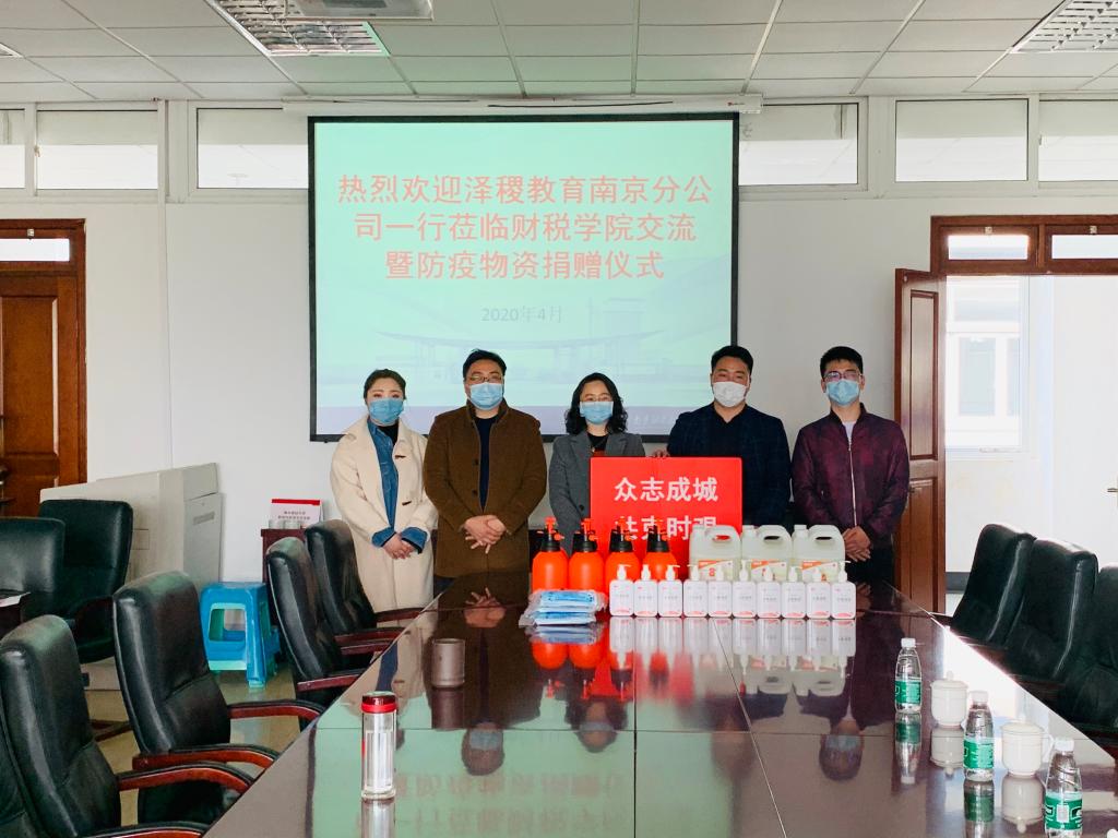 4月10日下午,泽稷教育南京市场部总监、总裁助理宁兆丰一行4人到toptoon 捐赠了高浓度消毒液、洗手凝胶、一次性口罩等防疫物资。院党委书记陈苏、院长朱军、党委副书记李慕原出席捐赠仪式。