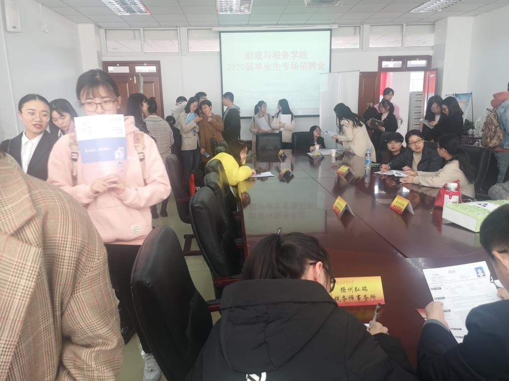 2020届毕业生秋季专场招聘活动在德经楼408室举行。江苏省注册税务师协会副会长徐火财,办公室主任徐华敏出席招聘会,2020届毕业生参加了招聘活动。