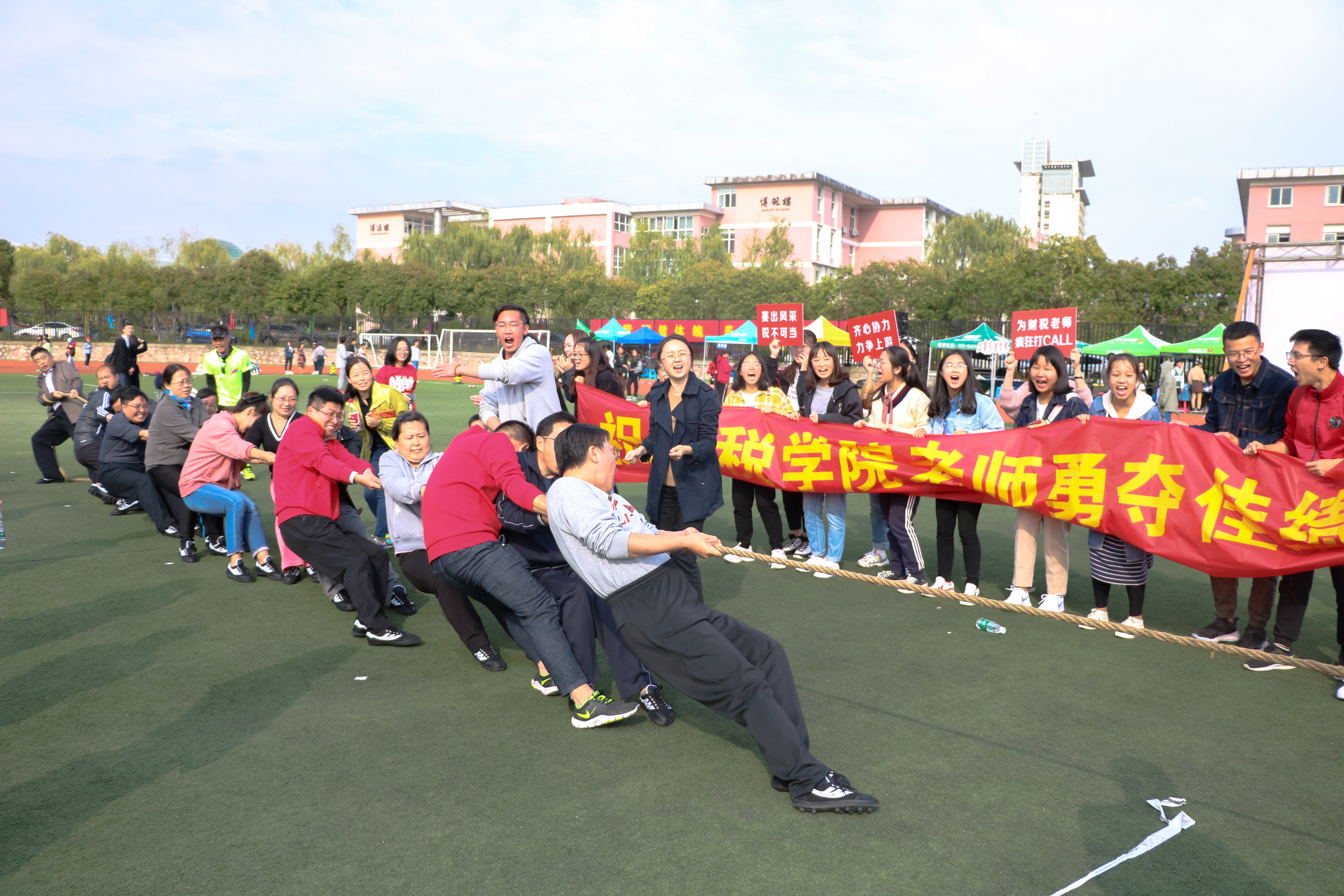 在师生4*100米接力赛中,刘志红、管永昊两位老师与刘世玉、杨翼虎两位同学联合组队,获得了第八名的好成绩。接下来的“步步为赢”、女子铅球、男子三级跳、女子1500等比赛中财税学子均以拼搏的精神、团体的凝聚力赢得了好成绩。而在教工组的比赛中,toptoon