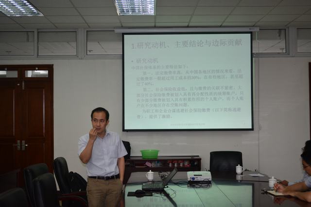 师生作了题为《社会保险缴费率、参保概率与缴费水平——对职工与企业逃避费行为的经验研究》的学术专题讲座。在学术报告开始前,学院副院长黄斌教授、副院长朱军副教授与毛捷副教授进行了深入的交流,就浙江大学、对外经贸大学的研究生培养、国际化战略、学科建设等方面进行了交流。