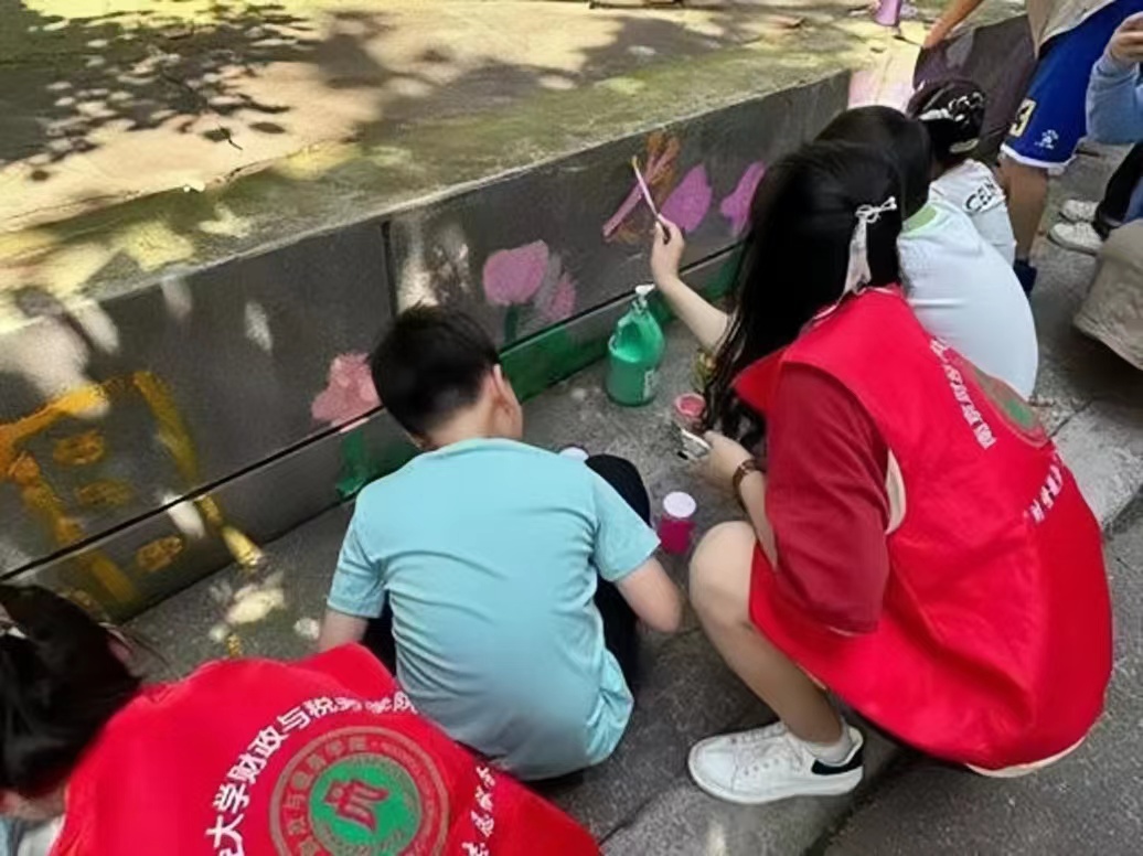 (“七彩童年”活动中,志愿者们与小朋友们共同完成社区墙面绘画的创作)
