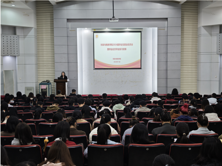 于德经楼报告厅召开了2026届毕业生就业实习动员会,学院党委书记陈苏、税收系主任刘亮亮,财政系副主任刘志红,教务科研办公室主任张洪慧,辅导员商慧,全体2026届毕业生参加会议。会议由学院党委副书记王翔主持。